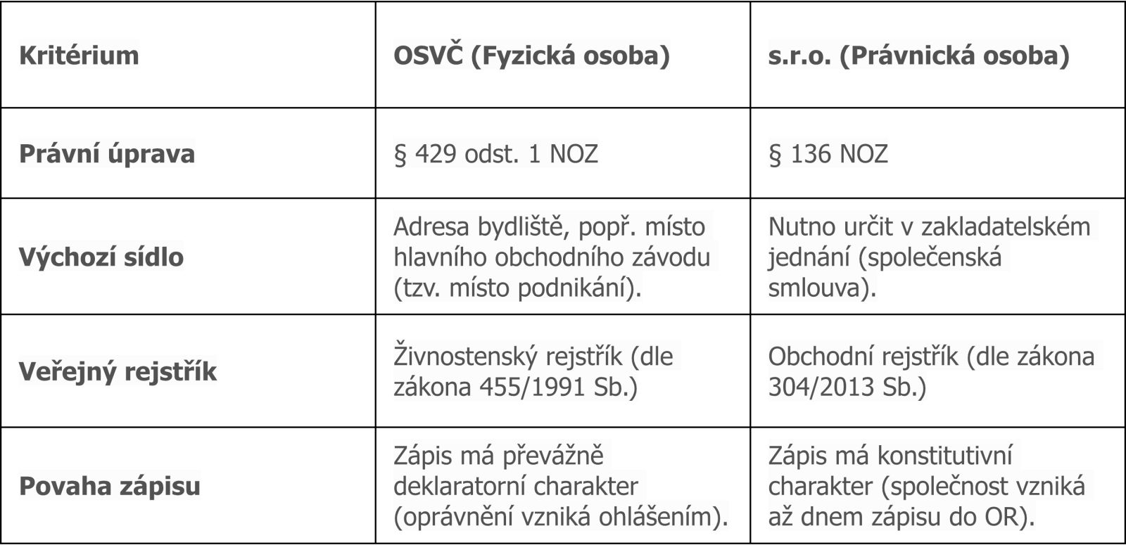 Rozdíly v nahlížení na sídlo u OSVČ a obchodních korporací (s.r.o.)