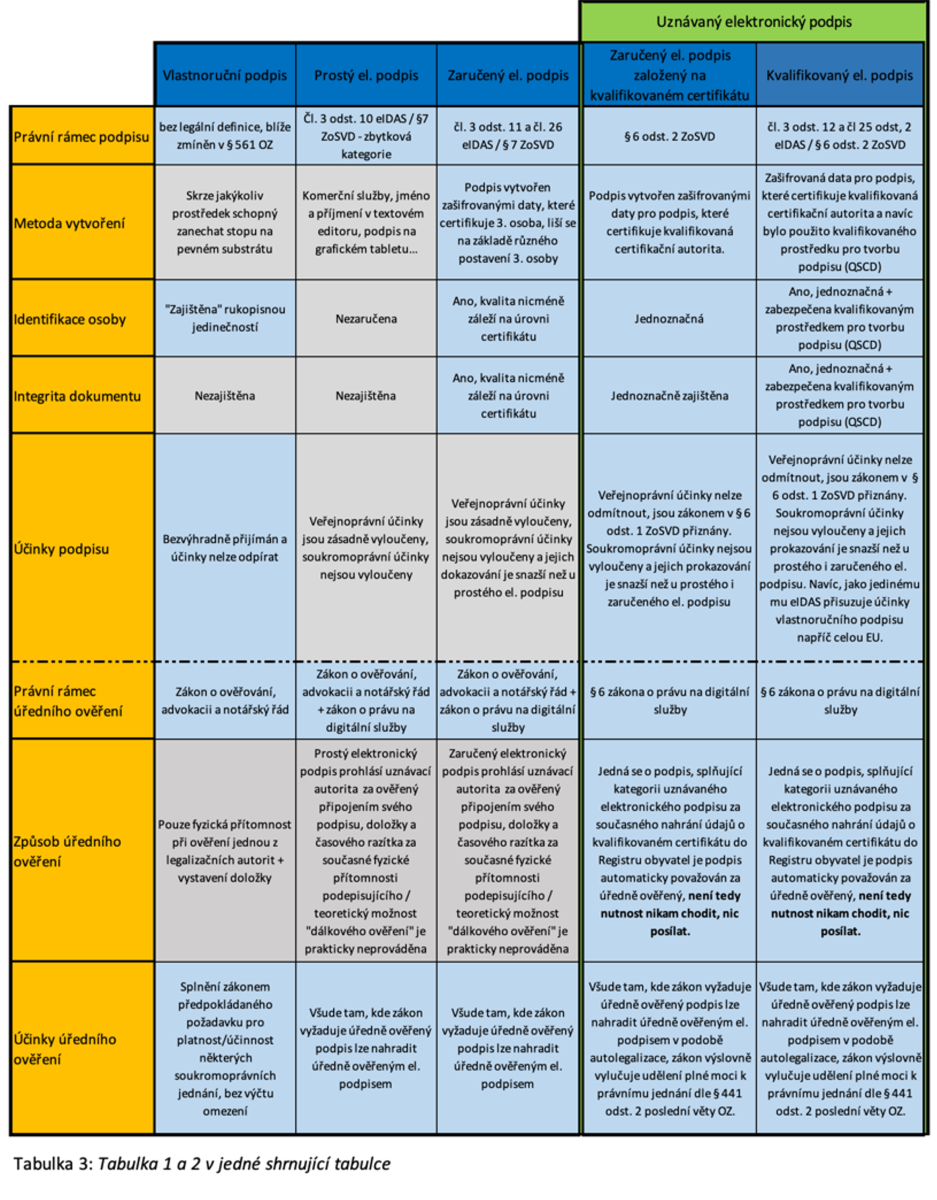 Tabulka 2: Pokračování předešlé tabulky, tato část tabulky znázorňuje rozdíly mezi úředním ověřováním jednotlivých druhů el. podpisů, včetně jejich účinků.