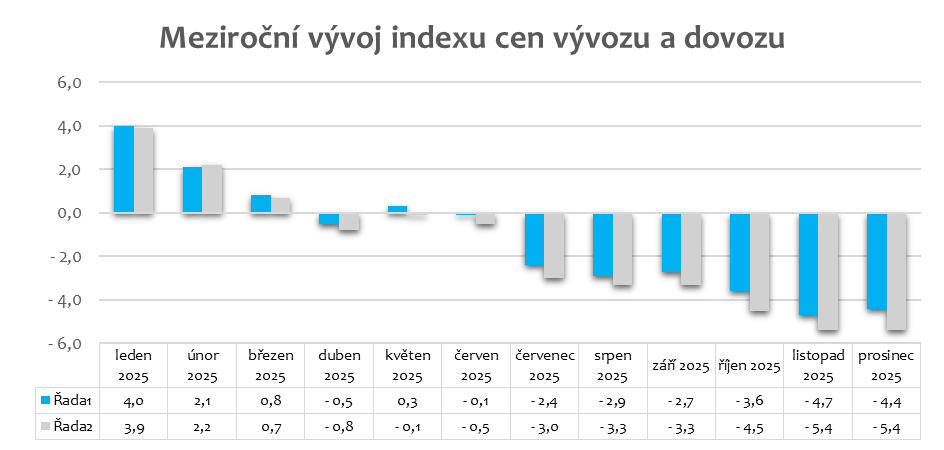 Vývoj cen v zahraničním obchodě v posledních letech ilustruje následující graf, který zachycuje index cen vývozu a dovozu (meziroční změny).